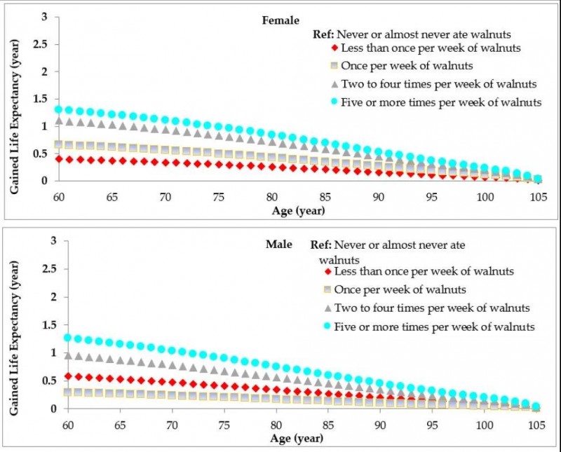 在这项为期20年、涉及9万多名受试者的研究中,研究人员发现,相比于从不或很少吃核桃的人,每周食用2-4份核桃(每份28克)的人群,其全因死亡风险降低了13%,心血管疾病死亡风险降低了14%。而当核桃食用量增加至每周5份或以上时,全因死亡风险和心血管疾病死亡风险分别降低了14%和25%。这一研究结果表明,核桃在预防心血管疾病方面具有显著效果。